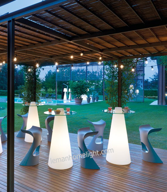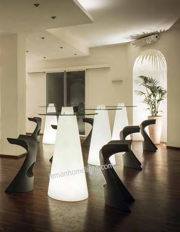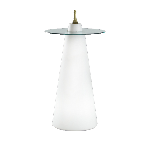 | PEAK - MANGE DEBOUT et TABLETTE EN VERRE Ce mobilier, lumineux, mange debout Peak se compose d'une base en polyéthylène sur laquelle s'encastre un plateau en verre transparent. Retro éclairage par led autonome sur batterie. Plateau en verre (épaisseur 0,8 cm) Extérieur et Intérieur Sans fil, batterie autonomie théorique 8h - temps de chargement 10h Couleurs réglables par télécommande